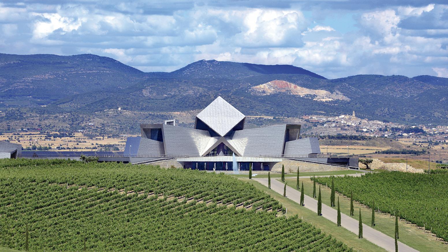 En este paisaje sorprende la arquitectura vanguardista de Bodega Sommos, con un diseño que muchos comparan con el Guggenheim por sus lÃneas geométricas y su impactante presencia en mitad del viñedo. Modernidad y territorio en perfecto equilibrio.
